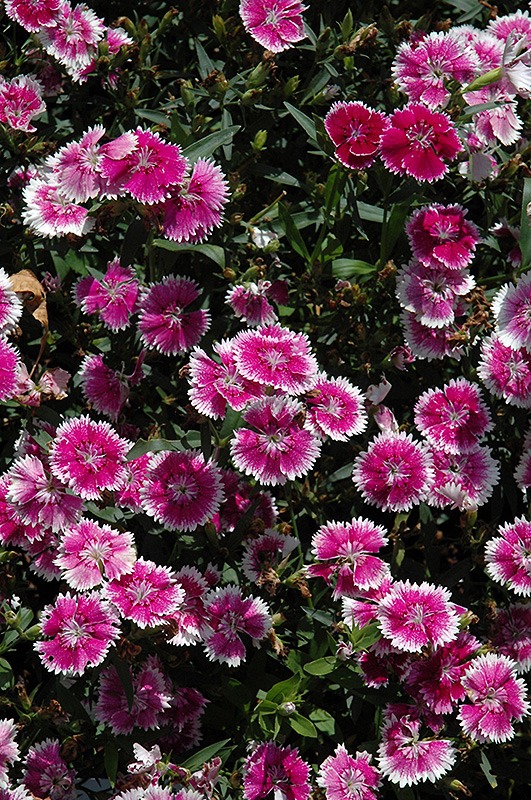 Telstar Purple Picotee Pinks will grow to be only 6 inches tall at maturity extending to 8 inches tall with the flowers, with a spread of 16 inches. When grown in masses or used as a bedding plant, individual plants should be spaced approximately 12 inches apart. Its foliage tends to remain low and dense right to the ground. It grows at a medium rate, and under ideal conditions can be expected to live for approximately 10 years. As an evegreen perennial, this plant will typically keep its form and foliage year-round.