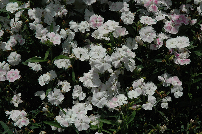 Telstar White Pinks will grow to be only 6 inches tall at maturity extending to 8 inches tall with the flowers, with a spread of 16 inches. When grown in masses or used as a bedding plant, individual plants should be spaced approximately 12 inches apart. Its foliage tends to remain low and dense right to the ground. It grows at a medium rate, and under ideal conditions can be expected to live for approximately 10 years. As an evegreen perennial, this plant will typically keep its form and foliage year-round.