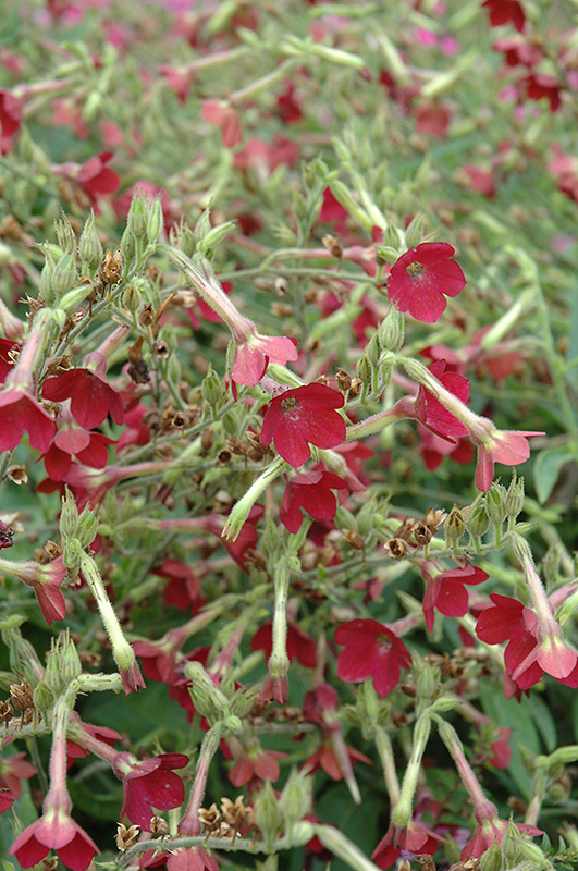 Baby Bella Flowering Tobacco features showy fragrant dark red star-shaped flowers at the ends of the stems from early summer to mid fall. Its pointy leaves remain green in colour throughout the season.