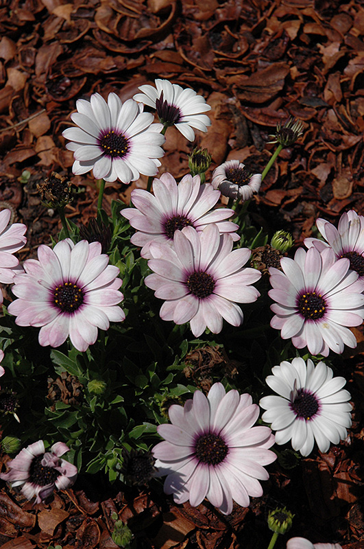 Fortunette White Blush African Daisy will grow to be about 10 inches tall at maturity, with a spread of 14 inches. When grown in masses or used as a bedding plant, individual plants should be spaced approximately 12 inches apart. Its foliage tends to remain low and dense right to the ground. Although it's not a true annual, this fast-growing plant can be expected to behave as an annual in our climate if left outdoors over the winter, usually needing replacement the following year. As such, gardeners should take into consideration that it will perform differently than it would in its native habitat.
