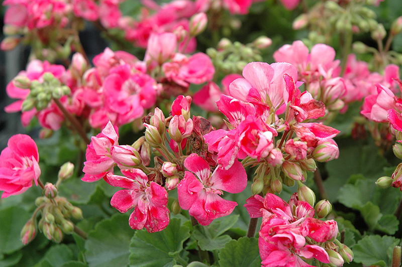 Pink plus Eye Geranium will grow to be about 12 inches tall at maturity, with a spread of 14 inches. When grown in masses or used as a bedding plant, individual plants should be spaced approximately 12 inches apart. Its foliage tends to remain dense right to the ground, not requiring facer plants in front. Although it's not a true annual, this fast-growing plant can be expected to behave as an annual in our climate if left outdoors over the winter, usually needing replacement the following year. As such, gardeners should take into consideration that it will perform differently than it would in its native habitat.