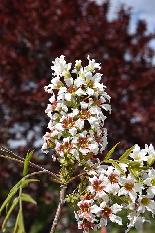 Yellowhorn is covered in stunning racemes of white trumpet-shaped flowers with yellow throats and antique red centers rising above the foliage in mid spring before the leaves. It has dark green deciduous foliage. The narrow pinnately compound leaves do not develop any appreciable fall colour. It produces brown nuts from early to mid fall.