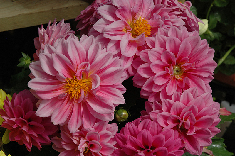 This stunning dahlia is a showy bloomer, producing masses of large deep pink flowers with yellow centers in mid-summer; wonderful along borders or in containers