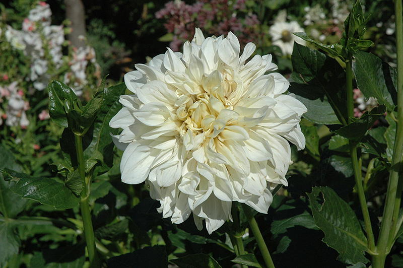 This extraordinary dahlia is a showy bloomer, producing masses of large elegant white flowers with cream centers in mid summer; wonderful along borders or in containers