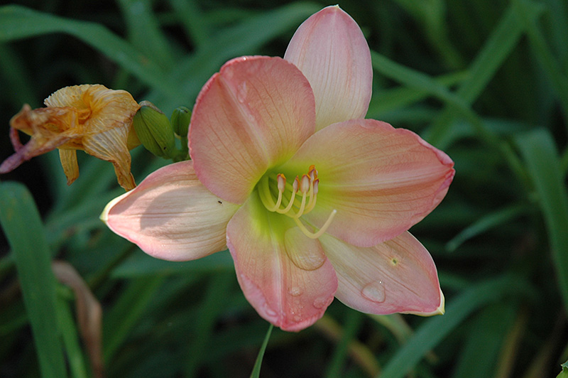 Elegant shell-pink trumpets with yellow-green throats; great grassy texture and form; diploid; a tremendous color addition to the garden or border