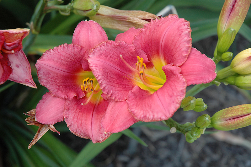 Stunning rose-pink trumpets with yellow throats surrounded by cherry red rings; great grassy texture and form; tetraploid; a tremendous color addition to the garden or border