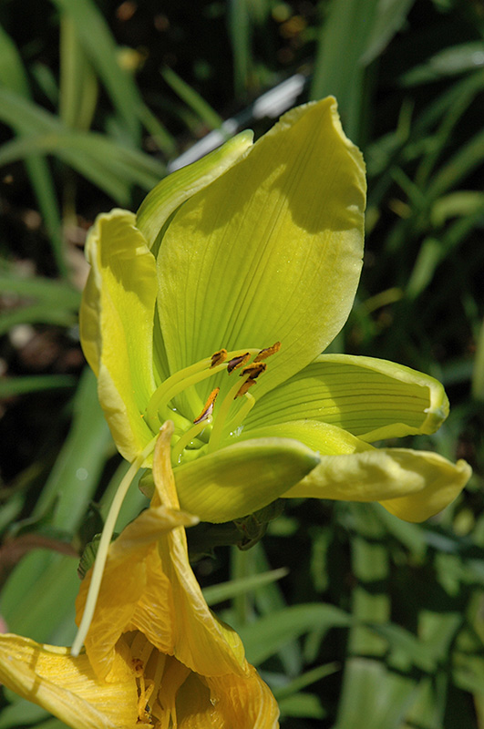 Green Pinwheel Daylily features bold lemon yellow trumpet-shaped flowers with lime green centers at the ends of the stems in mid summer. The flowers are excellent for cutting. Its grassy leaves remain green in colour throughout the year.