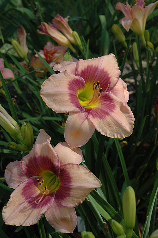 Large, elegant salmon-pink trumpets with yellow centers and purple eyezones; great grassy texture and form; diploid; easy to grow and maintain; a perfect addition to the garden or border