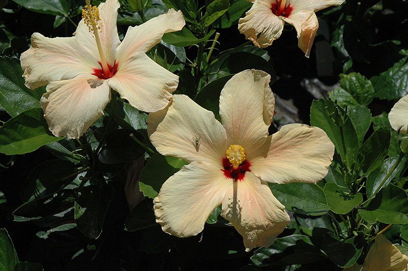 Single Peach Hibiscus features bold peach round flowers with creamy white overtones, dark red eyes and yellow anthers at the ends of the branches from mid summer to early fall. Its glossy pointy leaves remain dark green in colour throughout the year.