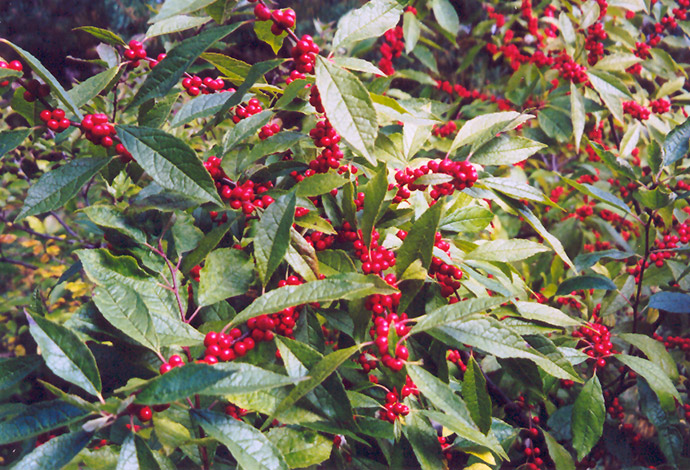 A deciduous holly valued for its extremely colorful and abundant red berries throughout winter, requires a male pollinator; upright growth habit, suckers into colonies; requires moist to wet acidic soils, good for problem areas; excellent when massed