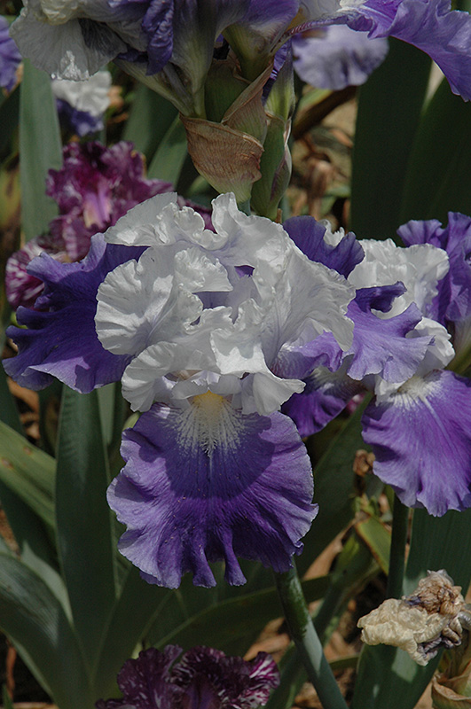 This tall, interesting iris produces luminous white-pale blue blooms with violet edged falls; a stunning addition to the perennial border; also excellent massed in groupings in the garden; will quickly form dense colonies