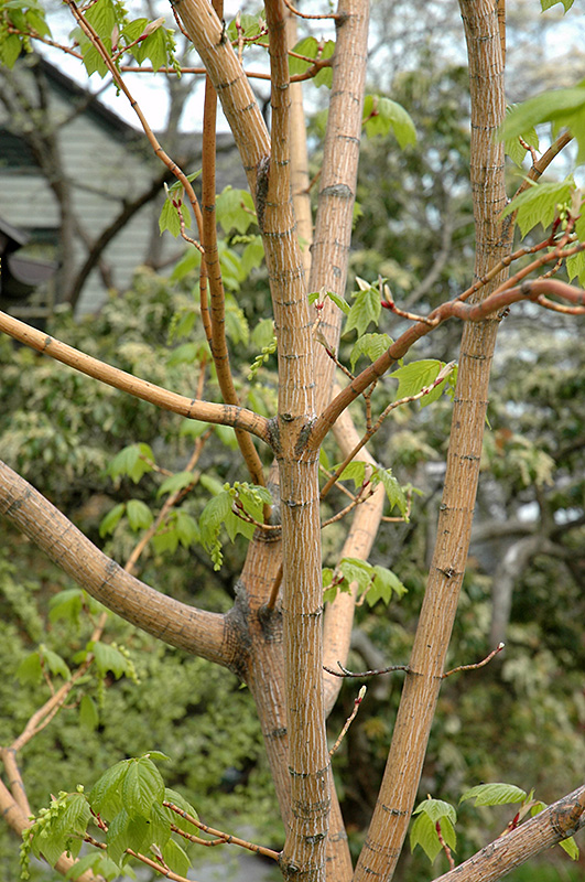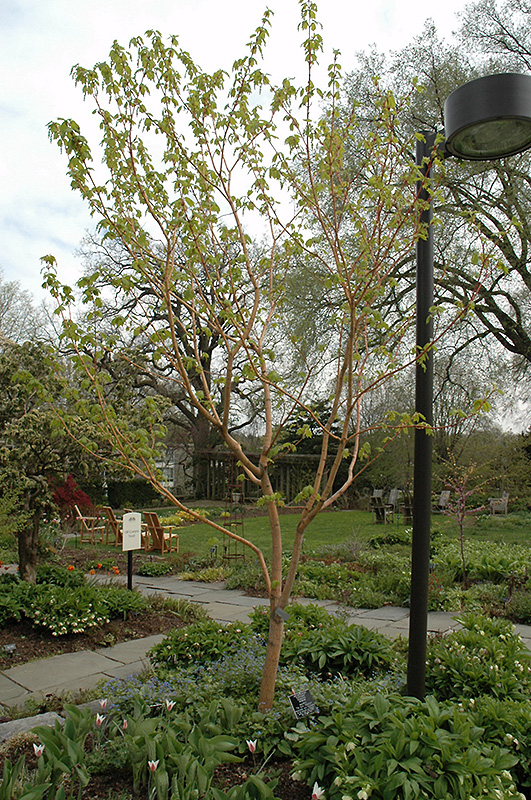 Erythrocladum Moosewood has emerald green deciduous foliage which emerges pink in spring on a tree with an upright spreading habit of growth. The lobed leaves turn an outstanding buttery yellow in the fall. The mottled pink bark and red branches are extremely showy and add significant winter interest.