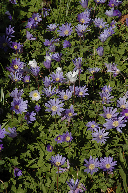 Grecian Windflower will grow to be about 12 inches tall at maturity, with a spread of 18 inches. Its foliage tends to remain dense right to the ground, not requiring facer plants in front. It grows at a medium rate, and under ideal conditions can be expected to live for approximately 10 years. As an herbaceous perennial, this plant will usually die back to the crown each winter, and will regrow from the base each spring. Be careful not to disturb the crown in late winter when it may not be readily seen! As this plant tends to go dormant in summer, it is best interplanted with late-season bloomers to hide the dying foliage.