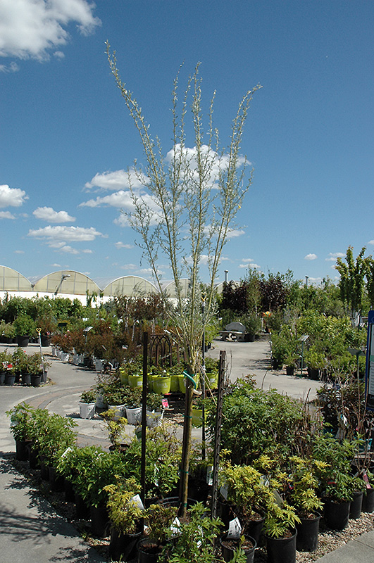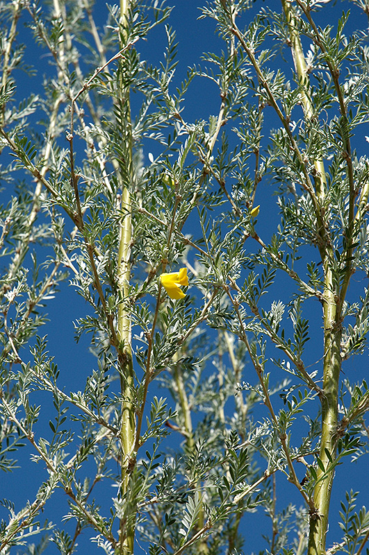 A fine specimen planting for very harsh or dry locations; tiny, sparkling silver leaves and an upright arching habit; yellow flowers in spring, followed by narrow red seed pods; perfect for a garden composition or foundation planting