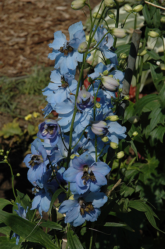 Moonlight Blues Larkspur will grow to be about 24 inches tall at maturity extending to 3 feet tall with the flowers, with a spread of 18 inches. When grown in masses or used as a bedding plant, individual plants should be spaced approximately 12 inches apart. It tends to be leggy, with a typical clearance of 1 foot from the ground, and should be underplanted with lower-growing perennials. The flower stalks can be weak and so it may require staking in exposed sites or excessively rich soils. It grows at a medium rate, and under ideal conditions can be expected to live for approximately 10 years. As an herbaceous perennial, this plant will usually die back to the crown each winter, and will regrow from the base each spring. Be careful not to disturb the crown in late winter when it may not be readily seen!
