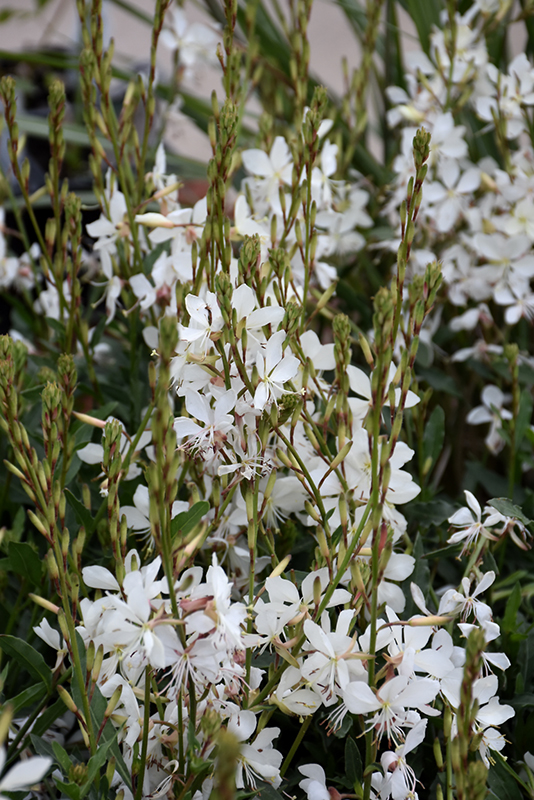 Sparkle White Gaura will grow to be about 24 inches tall at maturity, with a spread of 30 inches. When grown in masses or used as a bedding plant, individual plants should be spaced approximately 24 inches apart. Its foliage tends to remain dense right to the ground, not requiring facer plants in front. Although it's not a true annual, this fast-growing plant can be expected to behave as an annual in our climate if left outdoors over the winter, usually needing replacement the following year. As such, gardeners should take into consideration that it will perform differently than it would in its native habitat.