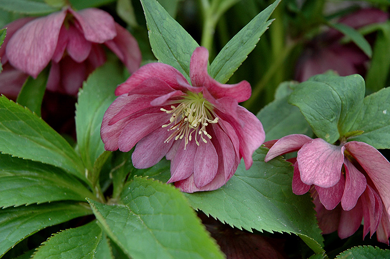 Heronswood Double Purple Hellebore features showy nodding double lavender cup-shaped flowers with pink overtones and buttery yellow eyes at the ends of the stems from late winter to early spring. Its attractive serrated oval compound leaves remain forest green in colour throughout the year.