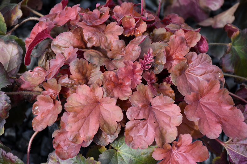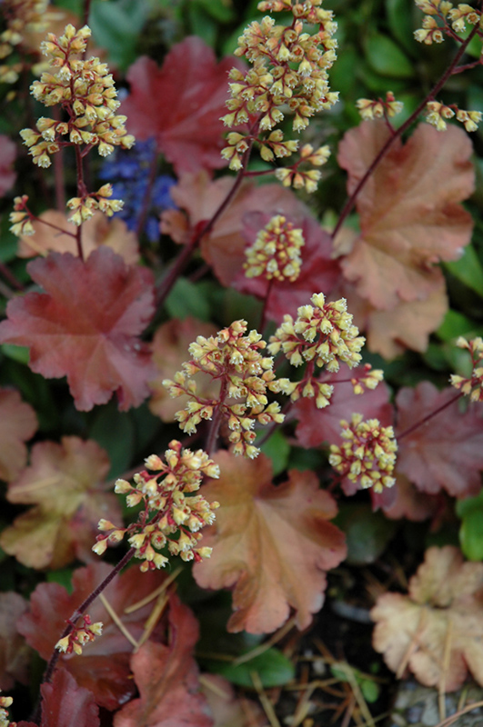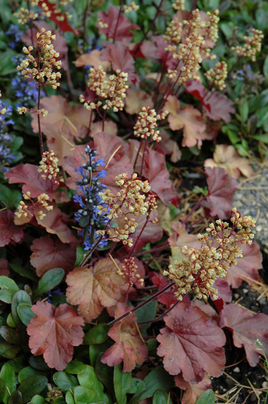Dainty spikes of pale yellow-caramel bells rise from a compact mound of coppery-tan foliage highlighted with reddish variegation; amazing contrast to other plants, great versatility; keep soil moist in the heat of summer