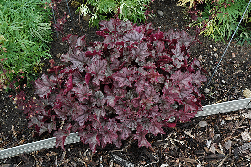 Crown Jewel Coral Bells will grow to be about 12 inches tall at maturity, with a spread of 18 inches. When grown in masses or used as a bedding plant, individual plants should be spaced approximately 14 inches apart. Its foliage tends to remain dense right to the ground, not requiring facer plants in front. It grows at a medium rate, and under ideal conditions can be expected to live for approximately 10 years. As an evegreen perennial, this plant will typically keep its form and foliage year-round.