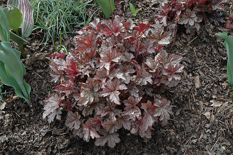 Gunsmoke Foamy Bells will grow to be about 13 inches tall at maturity extending to 19 inches tall with the flowers, with a spread of 25 inches. When grown in masses or used as a bedding plant, individual plants should be spaced approximately 22 inches apart. Its foliage tends to remain dense right to the ground, not requiring facer plants in front. It grows at a medium rate, and under ideal conditions can be expected to live for approximately 10 years. As an evegreen perennial, this plant will typically keep its form and foliage year-round.
