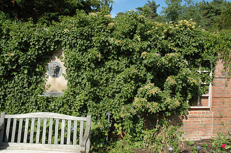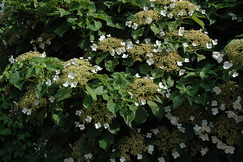 One of the most sought-after climbers, this vine makes an excellent flowering cover for vertical structures and trees, and can also be used as a groundcover; attractive white lacecap-like flowers in mid summer and clean foliage; a self-clinging vine