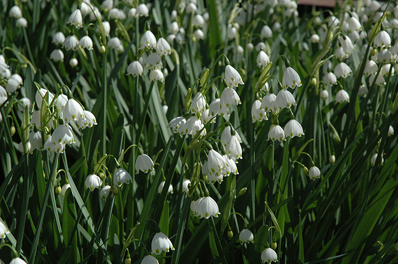 Gravetye Giant Summer Snowflake will grow to be about 18 inches tall at maturity extending to 28 inches tall with the flowers, with a spread of 18 inches. When grown in masses or used as a bedding plant, individual plants should be spaced approximately 14 inches apart. Its foliage tends to remain dense right to the ground, not requiring facer plants in front. It grows at a fast rate, and under ideal conditions can be expected to live for approximately 10 years. As an herbaceous perennial, this plant will usually die back to the crown each winter, and will regrow from the base each spring. Be careful not to disturb the crown in late winter when it may not be readily seen! As this plant tends to go dormant in summer, it is best interplanted with late-season bloomers to hide the dying foliage.