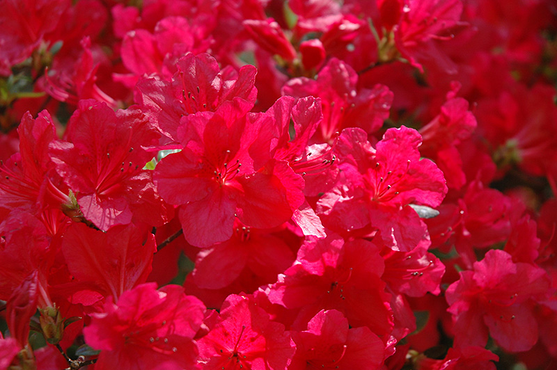 A stunning broadleaf evergreen rhododendron from the Kurume group with hot red flowers in spring and a sprawling habit; best with some shelter, absolutely must have well-drained, highly acidic and organic soil, use plenty of peat moss when planting