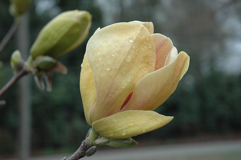 Hot Flash Magnolia is covered in stunning fragrant buttery yellow cup-shaped flowers with pink eyes held atop the branches in mid spring before the leaves. It has dark green deciduous foliage. The large pointy leaves turn coppery-bronze in fall.