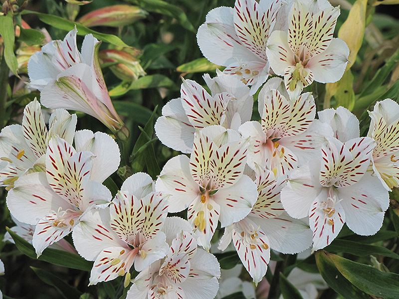 Casablanca Alstroemeria features showy bracted white trumpet-shaped flowers with yellow overtones, shell pink throats and burgundy spots at the ends of the stems from late spring to mid summer. The flowers are excellent for cutting. Its pointy leaves remain green in colour throughout the season.