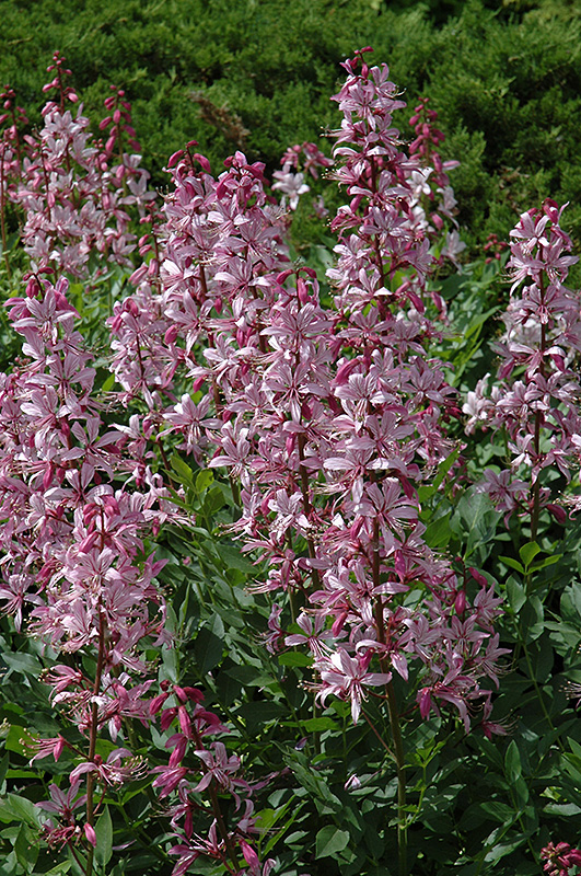 This variety produces stunning hot pink and white flower spikes in early summer above rich green foliage; blooms one year after planting and is slow to reach maturity; impressive when massed in the garden and worth the wait