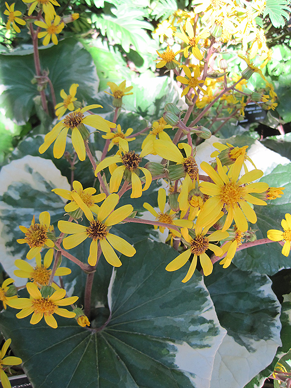 Silver Leopard Plant features showy clusters of yellow daisy flowers held atop the stems from early to mid fall. Its attractive glossy round leaves remain dark green in colour with showy white variegation and tinges of bluish-green throughout the year.