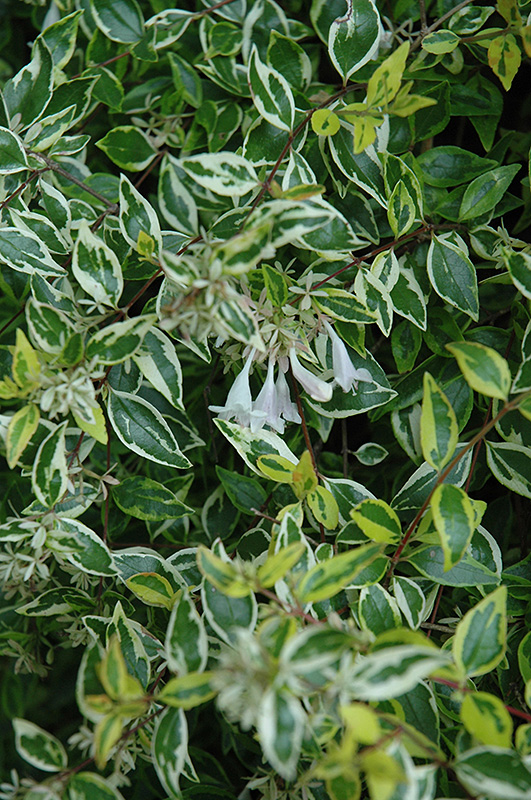 Hopley's Abelia features dainty clusters of lightly-scented white tubular flowers with shell pink overtones at the ends of the branches from mid spring to early summer, which emerge from distinctive lilac purple flower buds. It has attractive dark green foliage edged in creamy white with hints of gold which emerges buttery yellow in spring. The glossy oval leaves are highly ornamental and turn an outstanding pink in the fall, which persists throughout the winter.