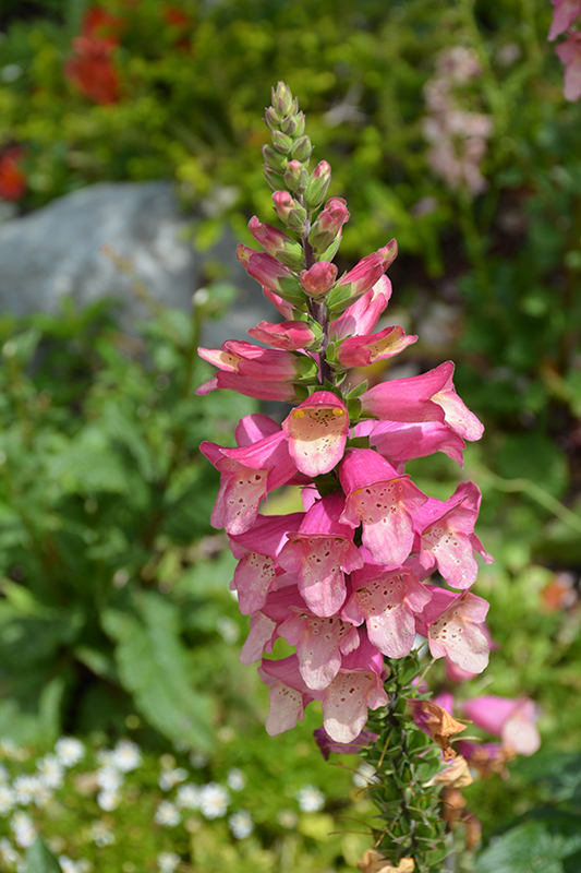 Berry Canary Tender Foxglove features bold spikes of hot pink tubular flowers with buttery yellow throats and burgundy spots rising above the foliage from late spring to mid fall. The flowers are excellent for cutting. Its glossy pointy leaves remain dark green in colour throughout the season. The brick red stems can be quite attractive.