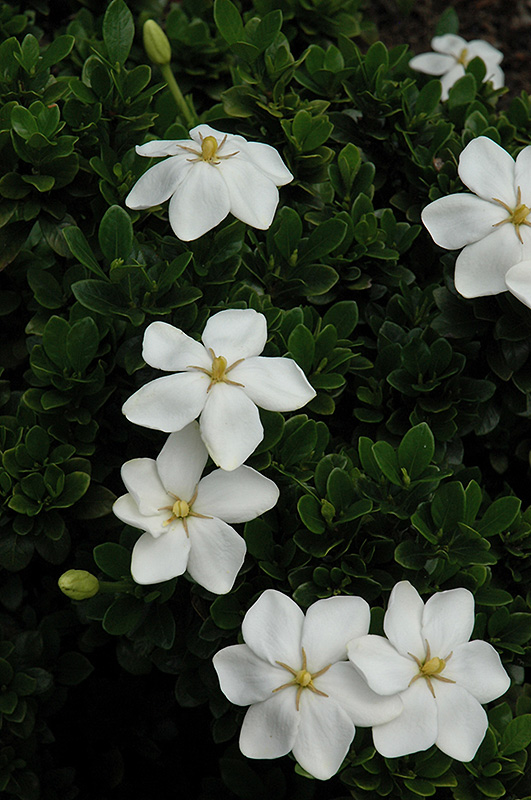 Lynn Lowrey Gardenia features showy fragrant white flowers with buttery yellow eyes at the ends of the branches from early to mid summer. The flowers are excellent for cutting. It has dark green evergreen foliage. The glossy pointy leaves remain dark green throughout the winter.