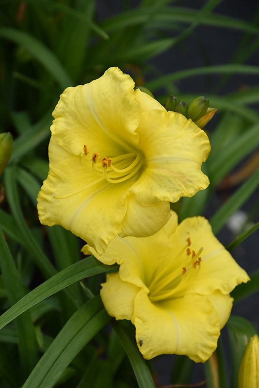 Montego Melon™ Kokomo™ Daylily features bold yellow trumpet-shaped flowers with light green throats and white stripes at the ends of the stems from early to mid summer. The flowers are excellent for cutting. Its grassy leaves remain green in colour throughout the season.