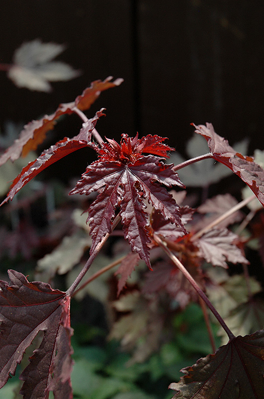 This bold plant features foliage similar to Japanese maple; dark red emerging foliage matures to deep burgundy; red flowers bloom sporadically; ideal foliage plant for the mixed garden border or containers