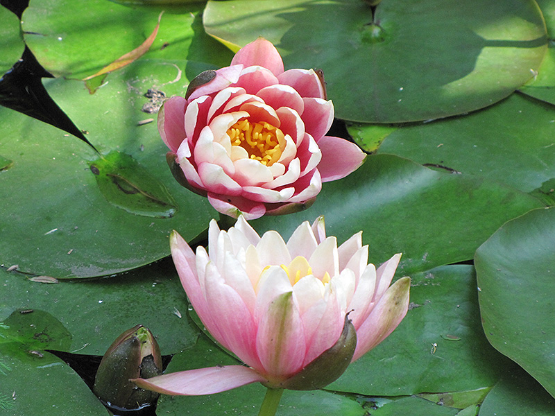 Pink Opal Hardy Water Lily features showy double rose star-shaped flowers with gold eyes and a white reverse at the ends of the stems from late spring to early fall. The flowers are excellent for cutting. Its attractive large glossy round leaves remain dark green in colour throughout the year.