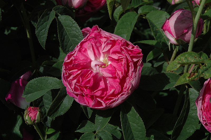 Charles De Mills Rose features showy lightly-scented fully double crimson flowers with hot pink overtones and gold eyes at the ends of the branches from early to late summer. The flowers are excellent for cutting. It has dark green deciduous foliage. The serrated oval compound leaves turn yellow in fall. The fruits are showy red hips displayed from mid to late fall. The spiny brick red bark adds an interesting dimension to the landscape.