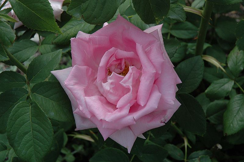 Georg Arends Rose features showy fragrant double pink recurved flowers with gold eyes at the ends of the branches from early summer to early fall. The flowers are excellent for cutting. It has dark green deciduous foliage. The serrated oval compound leaves turn yellow in fall. The fruits are showy red hips displayed from mid to late fall. The spiny brick red bark adds an interesting dimension to the landscape.