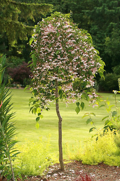 A dainty, weeping small tree, featuring lovely pink bell-shaped flowers hanging from gracefully weeping branches in early spring, very attractive; needs moist, organic soil and some shelter, does well in part shade