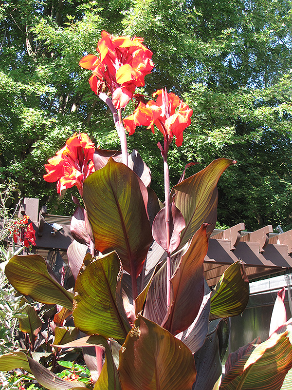 This very tall variety with huge, colorful leaves is crowned with brilliant coral-red blooms in summer and fall; perfect for the back of borders or as an accent; perennial only where roots don't freeze