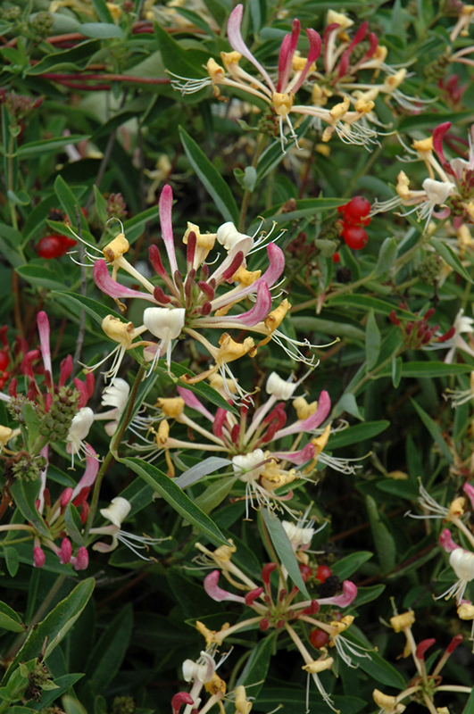 Sweet Tea Honeysuckle features showy clusters of fragrant buttery yellow trumpet-shaped flowers with white overtones at the ends of the branches from late spring to mid summer, which emerge from distinctive red flower buds. It features an abundance of magnificent red berries from mid to late summer. It has dark green foliage with grayish green undersides. The narrow leaves do not develop any appreciable fall colour.