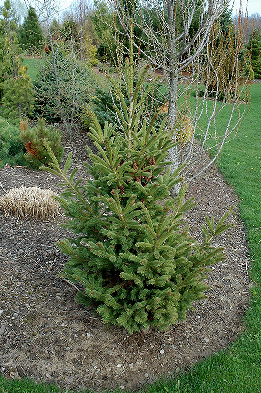 Mac's Golden White Spruce is a dwarf conifer which is primarily valued in the landscape or garden for its distinctively pyramidal habit of growth. It has attractive gold-variegated dark green foliage which emerges yellow in spring. The needles are highly ornamental and remain dark green throughout the winter. The brown fruits are held in cones from late summer to late fall.