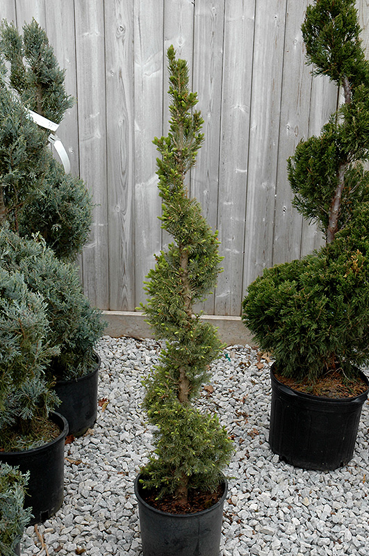Rainbow's End Spruce (spiral) is a dwarf conifer which is primarily valued in the landscape or garden for its rigidly columnar form. It has attractive dark green foliage with hints of yellow which emerges yellow in spring. The needles are highly ornamental and remain dark green throughout the winter.