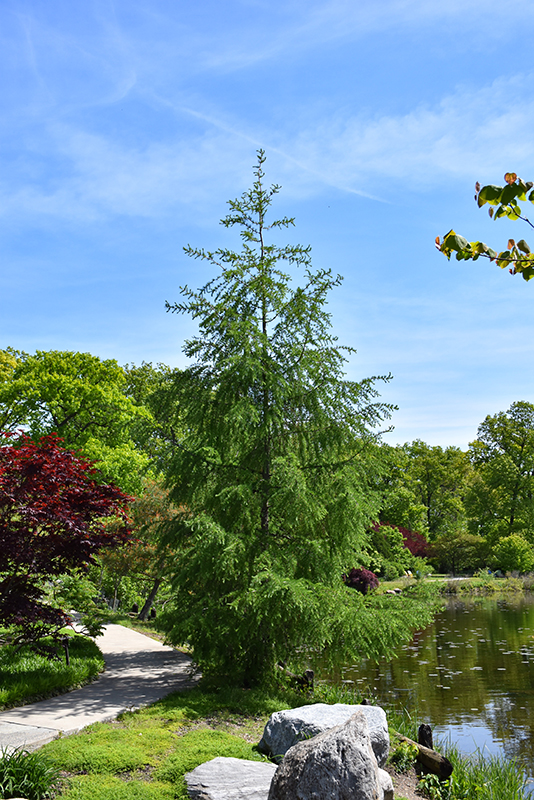 A tall and narrowly upright coniferous tree with deciduous needles which progress from green in spring to blue-green in summer, finally turning bright yellow in fall; prefers moist locations and sandier soils; looks a little bare in winter without needles