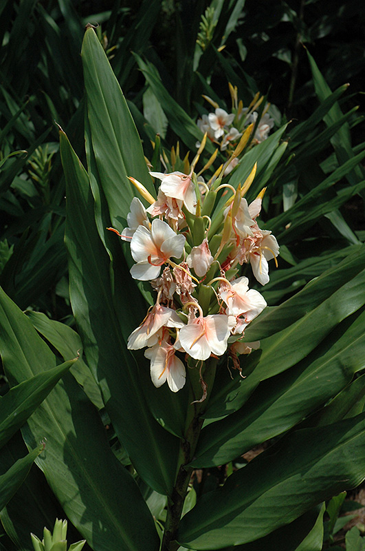 Mutant Hardy Ginger Lily features showy spikes of fragrant white orchid-like flowers with yellow overtones and coral-pink centers rising above the foliage from late summer to early fall, which emerge from distinctive gold flower buds. Its attractive textured oval leaves remain dark green in colour throughout the season.