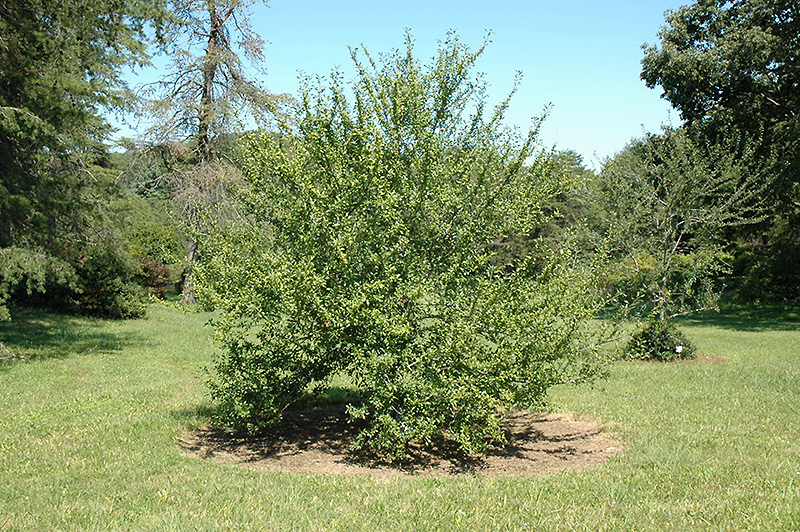 Benton Possumhaw Holly will grow to be about 15 feet tall at maturity, with a spread of 15 feet. It tends to be a little leggy, with a typical clearance of 2 feet from the ground, and is suitable for planting under power lines. It grows at a slow rate, and under ideal conditions can be expected to live for 40 years or more. This is a female variety of the species which requires a male selection of the same species growing nearby in order to set fruit.