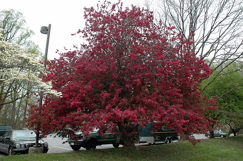 Burgundy Flowering Crab will grow to be about 25 feet tall at maturity, with a spread of 20 feet. It has a low canopy with a typical clearance of 4 feet from the ground, and is suitable for planting under power lines. It grows at a medium rate, and under ideal conditions can be expected to live for 50 years or more.