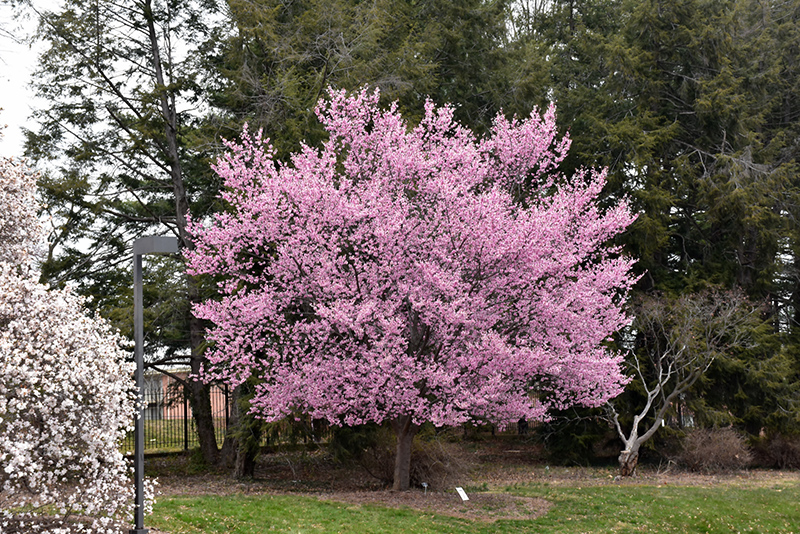 A beautiful spring flowering accent tree, featuring single medium pink flowers before the leaves, attractive reddish-brown bark and a beautiful, vase shaped habit of growth; needs full sun and well-drained soil; has a high tolerance to insects and disease