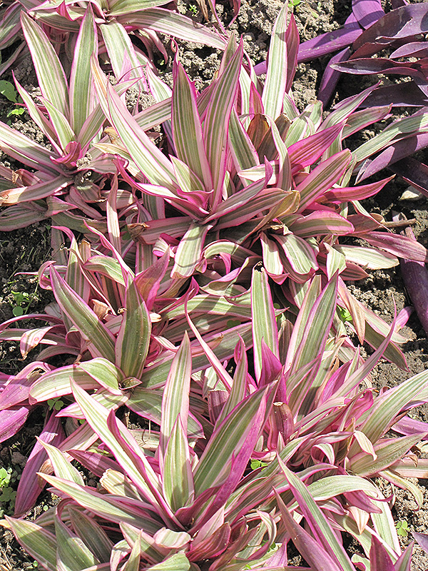 This selection is an excellent plant for borders, rock gardens, and massed as groundcover; a year-round bloomer with white flower clusters nestled in purple bracts; foliage is green and white striped with purple undersides; may be invasive in warm areas